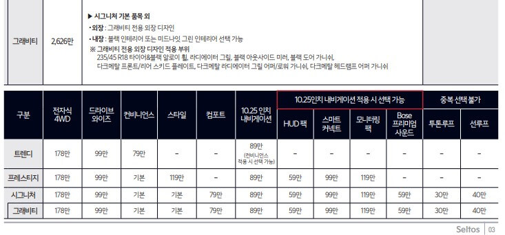 직물시트, 2열 6:4 폴딩 시트, 후방 모니터, 크루즈 컨트롤, 주행 중 후방 뷰, 하이패스 자동결제 시스템, 슈퍼비전 클러스터 4.2인치 칼라 TFT LCD까지 다 있습니다.