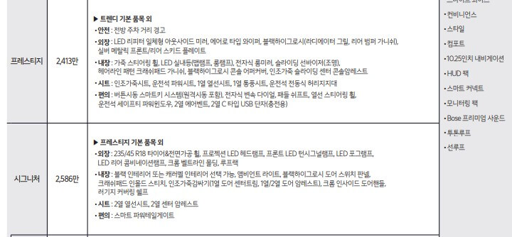 중간 트림인 프레스티지가 2,413만 원부터 시작합니다. 전방 주차거리 경고와 인조가죽시트, 1열 열선시트, 통풍시트, 버튼 스마트키,전방 주차거리 경고가 추가되었습니다.