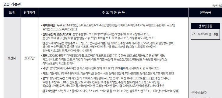 2.0 가솔린 기본 트림인 트렌디를 기준으로 2천87만 원부터 시작합니다. 1.6 엔진을 지닌 가솔린 터보 기본 트림은 약 1백만 원이 비싼 2천186만 원입니다. 달리기를 좋아하다면 터보 엔진을 엔진 관리 귀찮아하면 일반 가솔린 모델을 추천합니다.