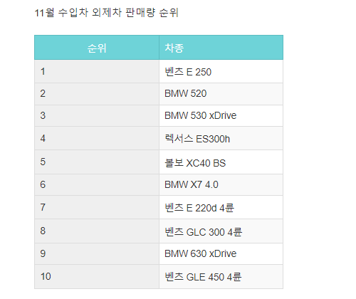 11월 수입차 외제차 판매 순위를 알아보겠습니다. 벤츠와 비엠의 판매량 순위는 변동이 없지만 치열합니다. 벤츠와 BMW의 치열한 프로모션을 알아볼까요?