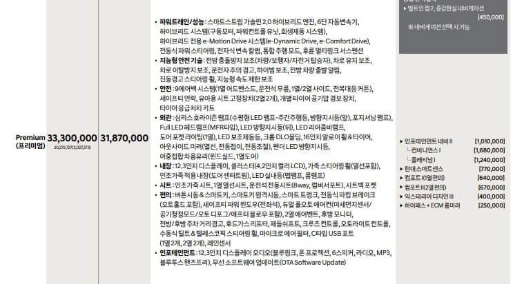 쏘나타 하이브리드 DN8 깡통 가격이 3,187만 원입니다. 현대차 1월 기준 최대 할인 혜택 110만 원을 받을 수 있는데, 카드 만드는 포인트 할인이나 전시차 구매 같은 품목을 빼고 60만 원 할인 받아도 3127만 원 정도에 구입할 수 있습니다. 재고차 할인 받으면 더 할인 받을 수 있습니다.