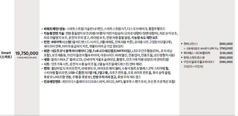 대한민국에서 가장 경제적이며 가성비 좋고, 중고가격 방어도 잘 되고 디자인도 훌륭한 팔방미인입니다. 가장 저렴하고 가성비 뛰어난 기본트림 깡통을 보고 놀라움을 감출 수 없었습니다. 이런 것들이 다 기본으로 장착되어 있다고?