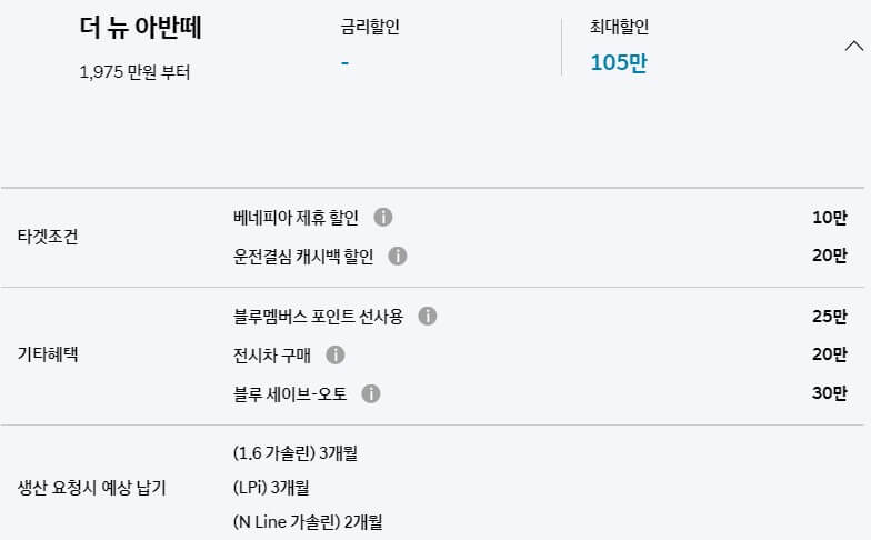 더뉴 아반떼는 105만 원까지 할인받을 수 있습니다. 베네피아 제휴 할인 10만 원, 운전결심 캐시백 할인 20만 원, 블루멤버스 포인트 선사용 25만 원, 전시차 구매 20만 원, 블루 세이브-오토 30만 원해서 도합 105만 원을 할인받을 수 있습니다.