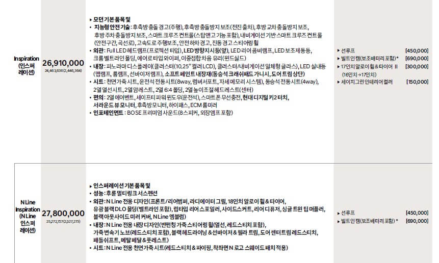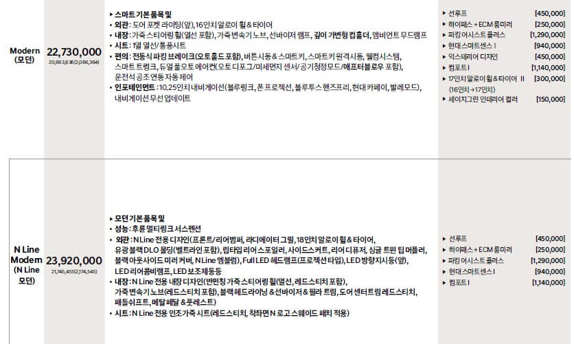 스포츠카처럼 부릉부릉 쿵쿵 팝콘 튀기는 소리는 내는 N라인의 경우 1.6 하이브리드 차량이 2,798만 원 하구요. 스포츠카 같은 괴력을 발휘하기에 연비는 다소 떨어져서 18.5km/l만 간다. 일반 1.6 가솔린 모델의 경우 14.5km/l 정도 합니다.