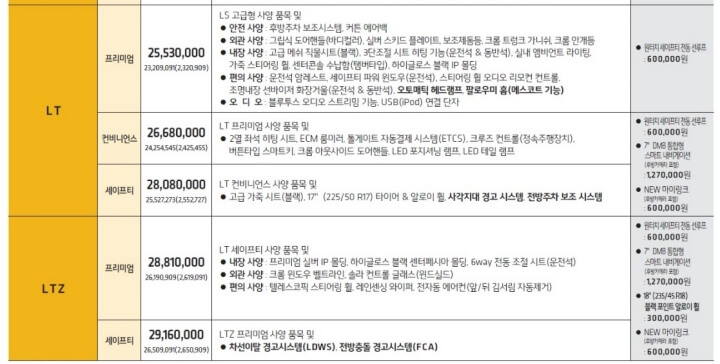 LTZ는 운전석 전동 시트 조절이 된다는 점이 있고 전자동 에어컨이 달려 있습니다. 세이프티 트리에는 차선이탈 경고시스템과 전방충돌 경고시스템이 있습니다.