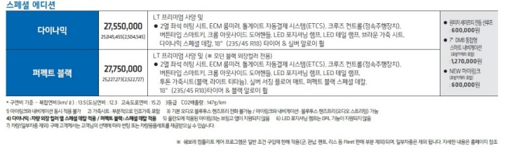 풀옵션에는 다음과 같은 편의 사양이 있습니다. 2열 열선시트, 젠2 변속기, 마이링크, 전방감지기, 사각지대 경고시스템, 전동식 조향장치, LED 방향지시등 이 있습니다.