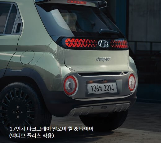캐스퍼에 풀옵션에 장착되는 것이 휠입니다. 17인치 알로이휠로 중형차 못지 않은 타이어를 장착하여 안전성을 높였습니다.