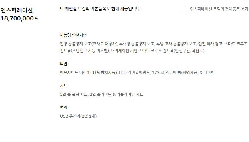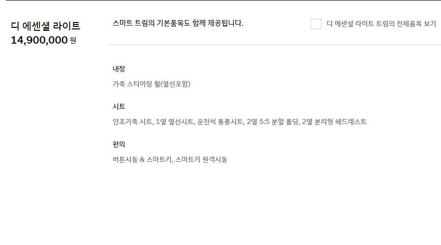 그 다음 트림은 디 에센셜 라이트 트림입니다. 가격은 14,900,000 원으로 1천 5백만 원을 생각하면 됩니다. 열선이 장착된 가죽 스티어링 휠, 인조가죽 시트, 1열 열선시트, 운전석 통풍시트, 2열 5:5 분할 폴딩, 2열 분리형 헤드레스트와 버튼시동 & 스마트키, 스마트키 원격시동을 걸 수 있습니다.
