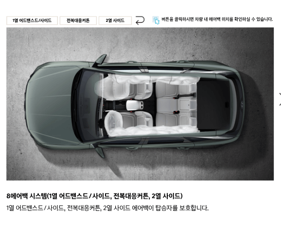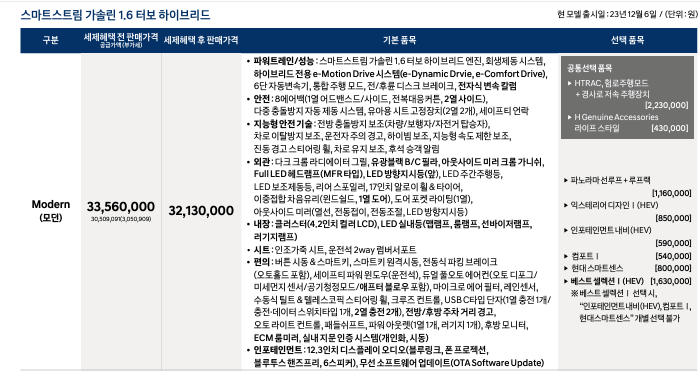 기본 트림이 모던 등급입니다. 하이브리드 차량으로 6단 자동변속기, 8개의 에어백, 전방 충동방지 보조, 차로 이탈방지 보조, 차로 유지 보조, 지능형 속도 제한 보조,