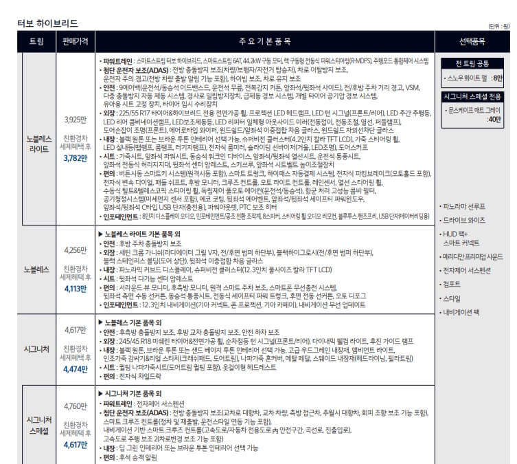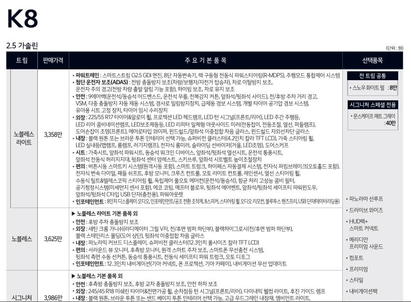 K8 하이브리드 내부 사진을 살펴보았고, K8의 옵션 및 기능 외장 내장에 대해 안내하고 있는 팜플렛을 찾아보았습니다.
