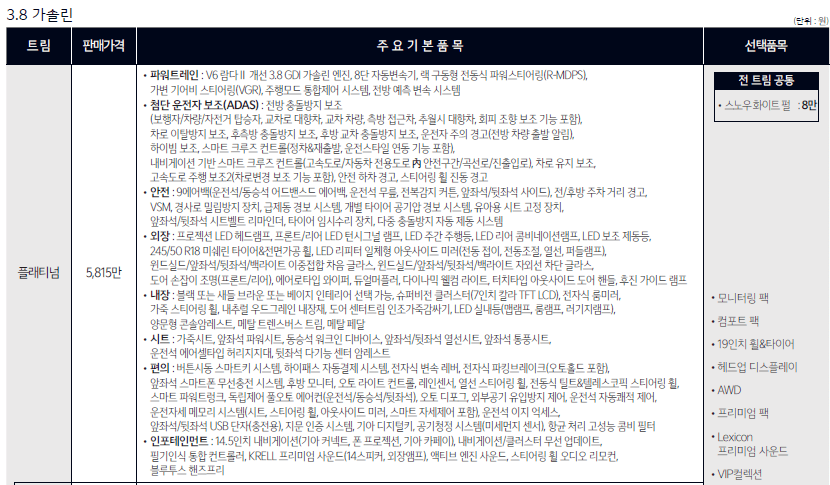 3.8 가솔린 엔진 기본 트림 가격은 5,815만 원부터 시작합니다. 8단 자동변속기가 들어가 있습니다.